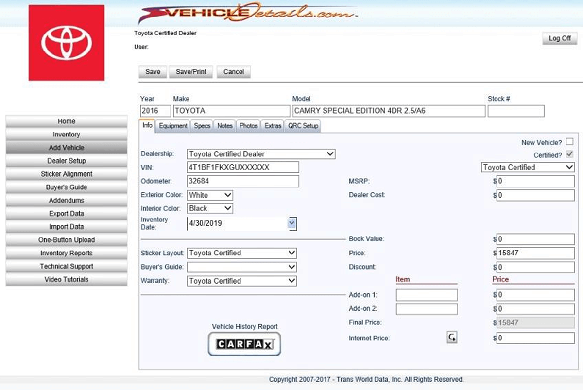 In the VEHICLE BUILD screen, enter Color, Stock Number, Price and Internet Price. *Internet Price will be used for the QR-Code generated Vehicle Listing URL